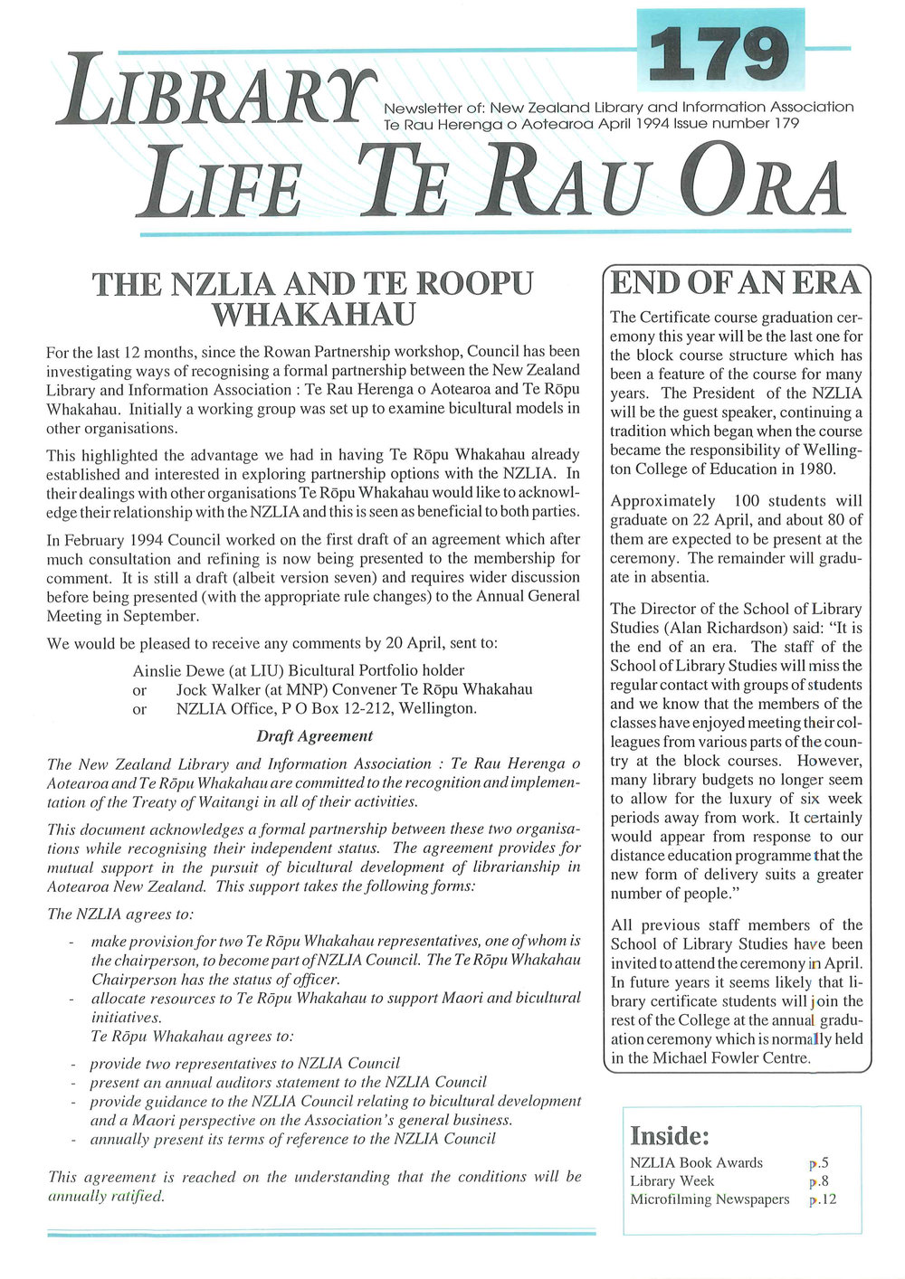 ![]() | [...]u Herenga o Aoteoroo April 1994 Issue number 179 LIFE TE RAU ORA THE NZLIA AND TE ROOPU WHAKAHAU F[...]sing a formal partnership between the New Zealand Library and Information Association : Te Rau Herenga o Ao[...]12, Wellington. Draft Agreement The New Zealand Library and Information Association : Te Rau Herenga 0 Ao[...]- ate in absentia. The Director of the School of Library Studies (Alan Richardson) said: “It is the end of an era. The staff of the School of Library Studies will miss the regular contact with group[...]he coun- try at the block courses. However, many library budgets no longer seem to allow for the luxury of[...].” All previous staff members of the School of Library Studies have been invited to attend the ceremony[...]Fowler Centre. y Inside: 1 NZLIA Book Awards p.5 Library Week p.8 . Microfilming Newspapers p.12 4, T T? |
