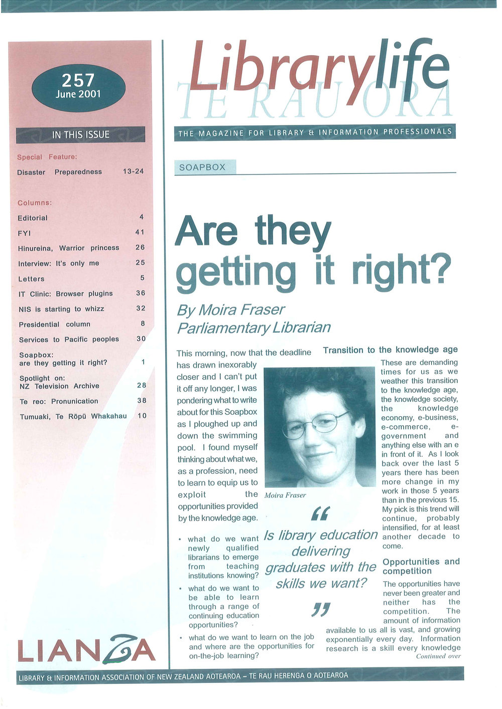 ![]() | [...]28 38 10 Librarylife THE MAGAZINE FOR LIBRARY 8 INFORMATION PROFESSIONALS SOAPBOX Are they[...]re the opportunities for on-the—job learning? LIBRARY St INFORMATION ASSOCIATION OF NEW ZEALAND AOTEAROA — TE RAU HERENGA O AOTEAROA Moira Fraser it /3 library education delivering graduates with the s[...] |