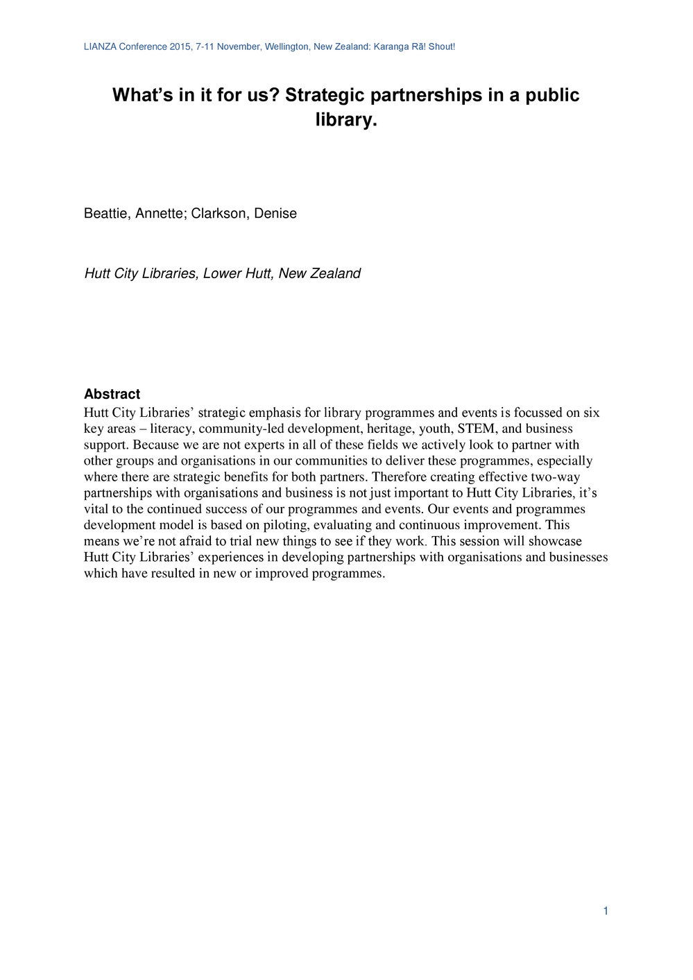 Lianza (23rd May 2017). What's in it for us? Strategic Partnerships in a public library. Beattie, A; Clarkson, D.. In Website Lianza. Retrieved 19th Mar 2026 20:52, from https://lianza.recollect.co.nz/nodes/view/1969