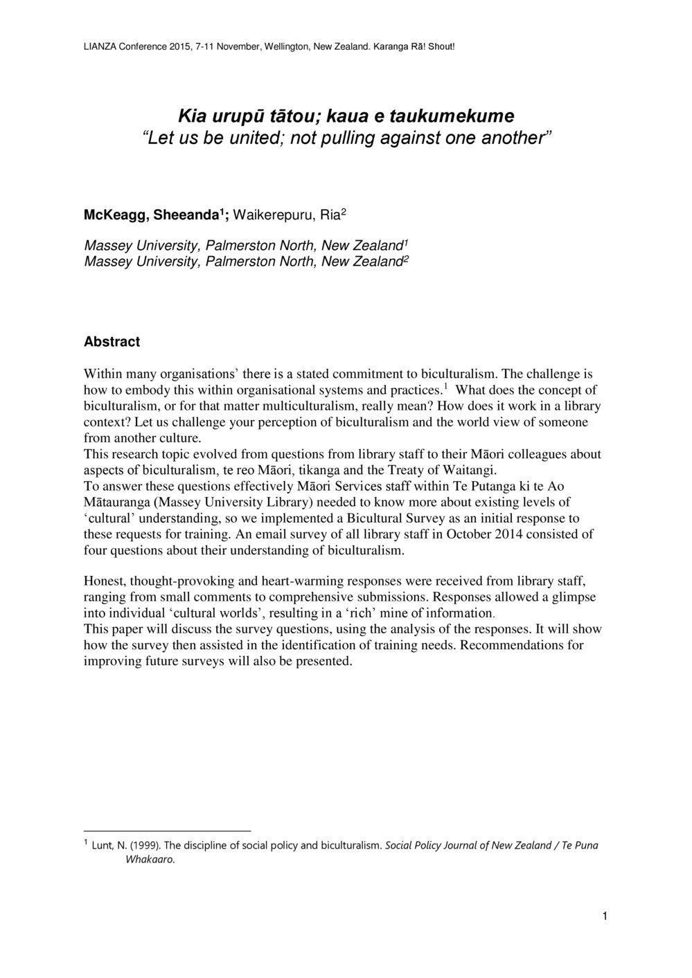 Lianza (23rd May 2017). Kia urupū tātou; kaua e taukumekume "Let us be united; not pulling against one another" McKeagg, S; Waikerepuru, R. . In Website Lianza. Retrieved 8th Apr 2026 02:41, from https://lianza.recollect.co.nz/nodes/view/1971
