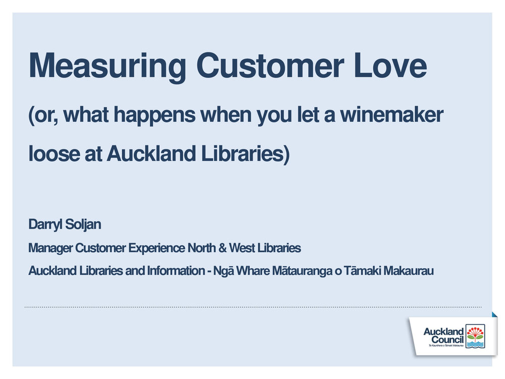 Lianza (17th Jan 2025). Measuring Customer Love (or, what happens when you let a winemaker loose at Auckland Libraries), Darryl Soljan. In Website Lianza. Retrieved 19th Mar 2026 18:47, from https://lianza.recollect.co.nz/nodes/view/2045
