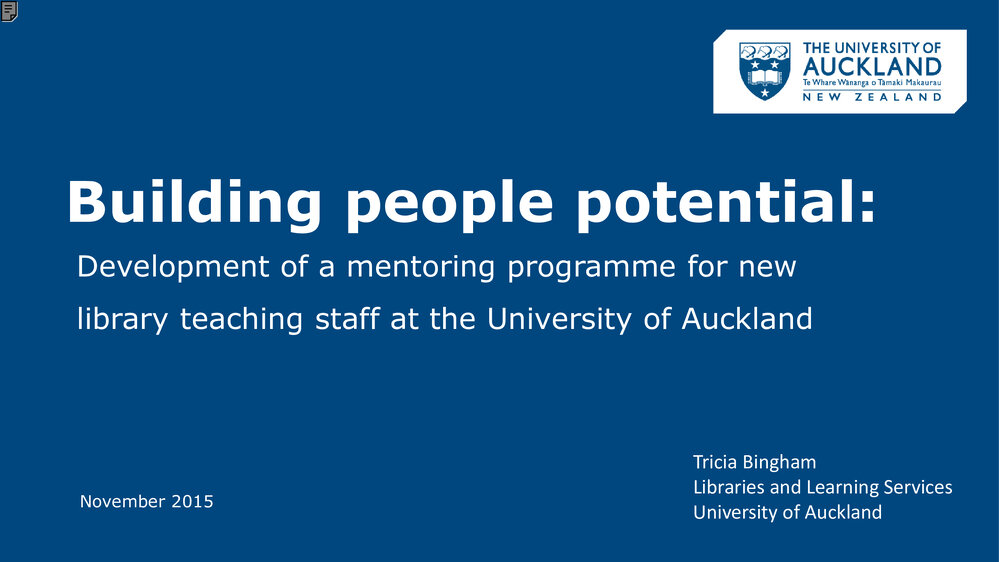 AuthorTricia BinghamConferenceLianza Conference 2015: Shout!Paper TitleBuilding people potential: Development of a mentoring programme for new library teaching staff at the University of AucklandThank you…