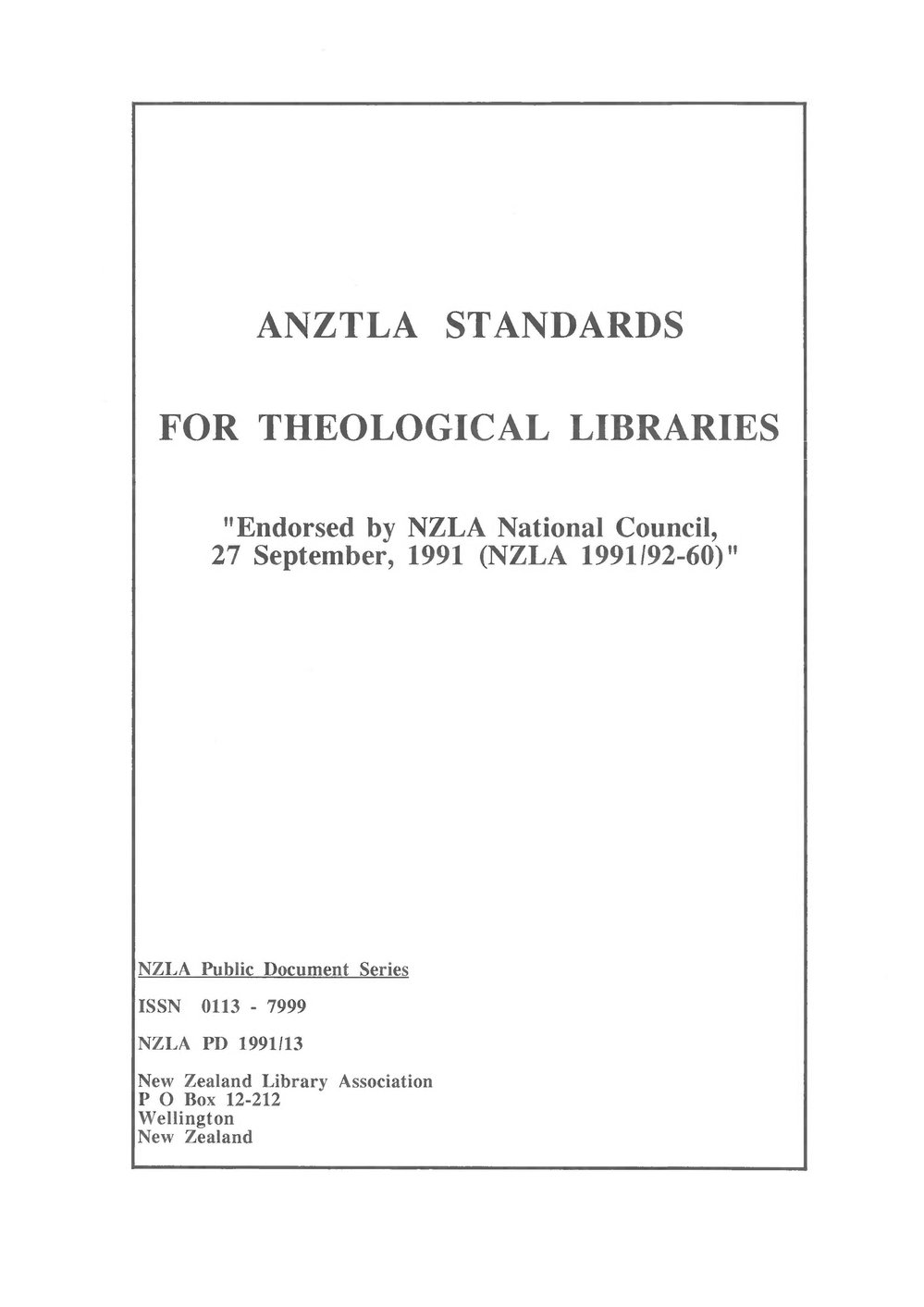 ANZTLA Standards for Theological Libraries "Endorsed by NZLA National Council, 27 September, 1991 (NZLA 1991/92-60)"