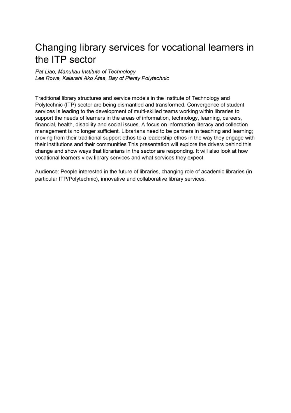 Lianza (23rd May 2017). Changing library services for vocational learners in the ITP sector. In Website Lianza. Retrieved 20th Mar 2026 00:24, from https://lianza.recollect.co.nz/nodes/view/2598