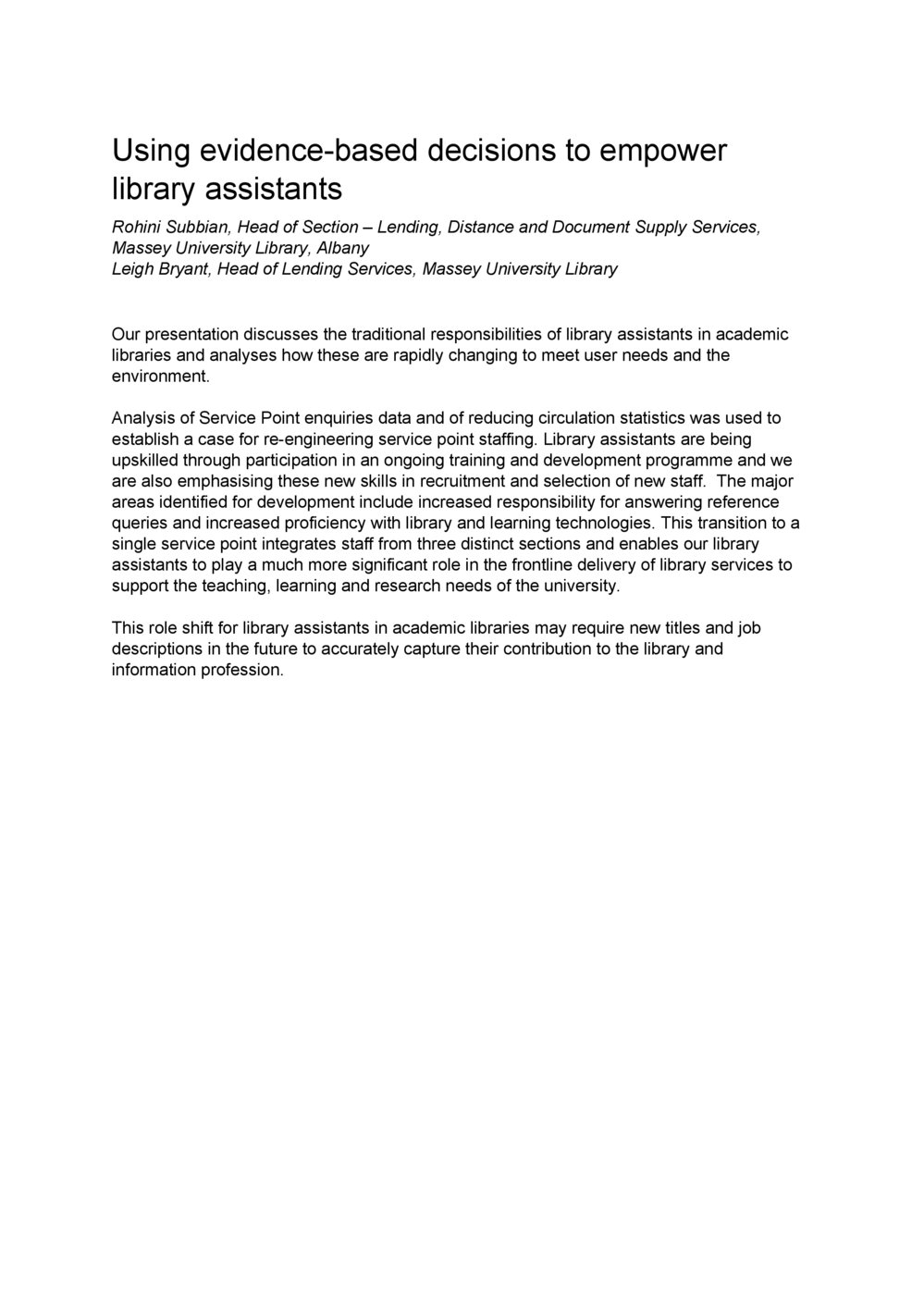Lianza (23rd May 2017). Using evidence-based decisions to empower library assistants. In Website Lianza. Retrieved 20th Mar 2026 00:25, from https://lianza.recollect.co.nz/nodes/view/2616