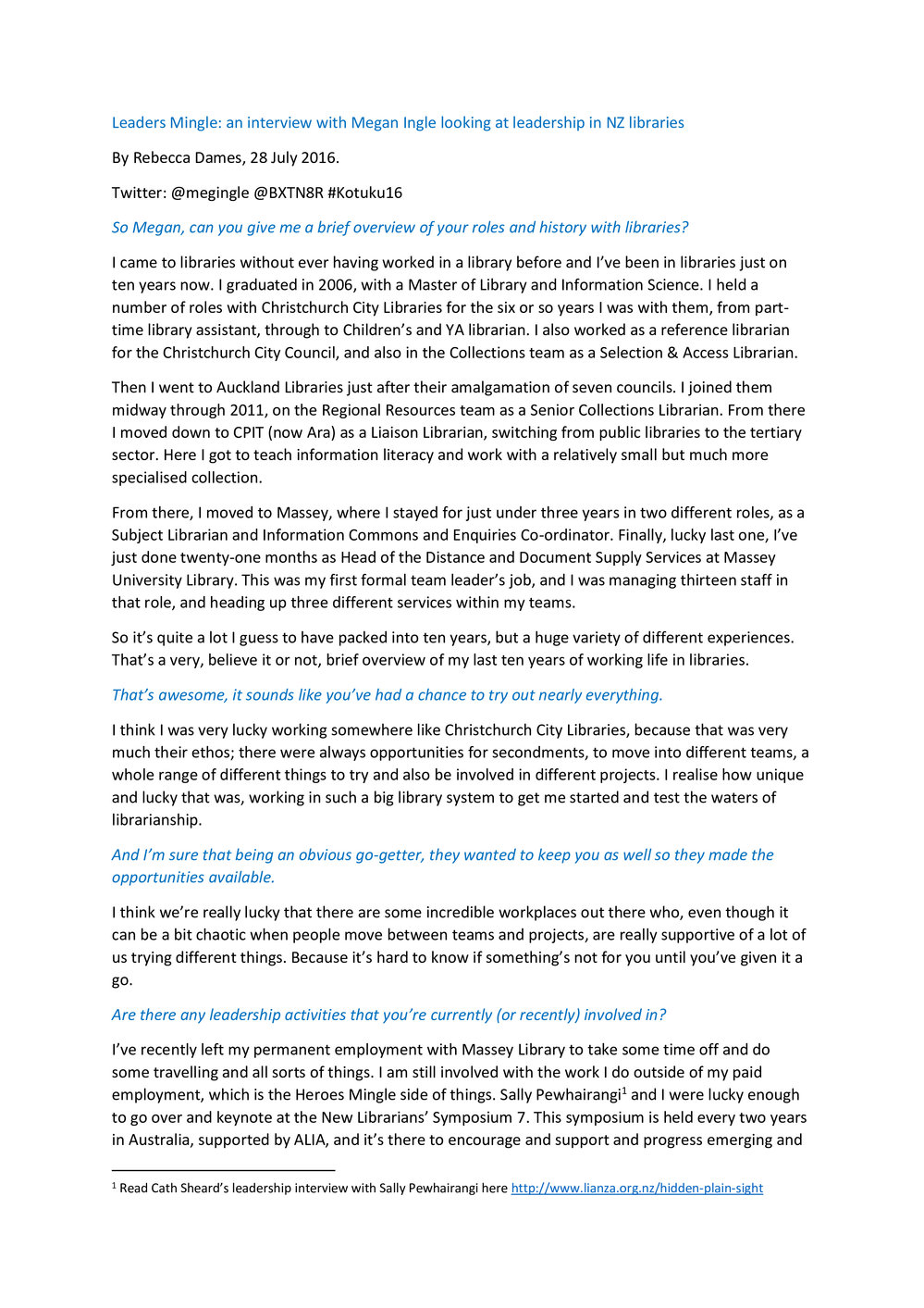 Lianza (2nd Feb 2018). Leaders Mingle: an interview with Megan Ingle looking at leadership in NZ Libraries. In Website Lianza. Retrieved 20th Mar 2026 04:56, from https://lianza.recollect.co.nz/nodes/view/5099