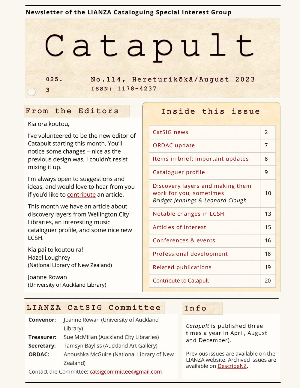 Lianza (29th Aug 2024). Catapult Issue 114 - August 2023. In Website Lianza. Retrieved 6th Apr 2026 08:21, from https://lianza.recollect.co.nz/nodes/view/6449