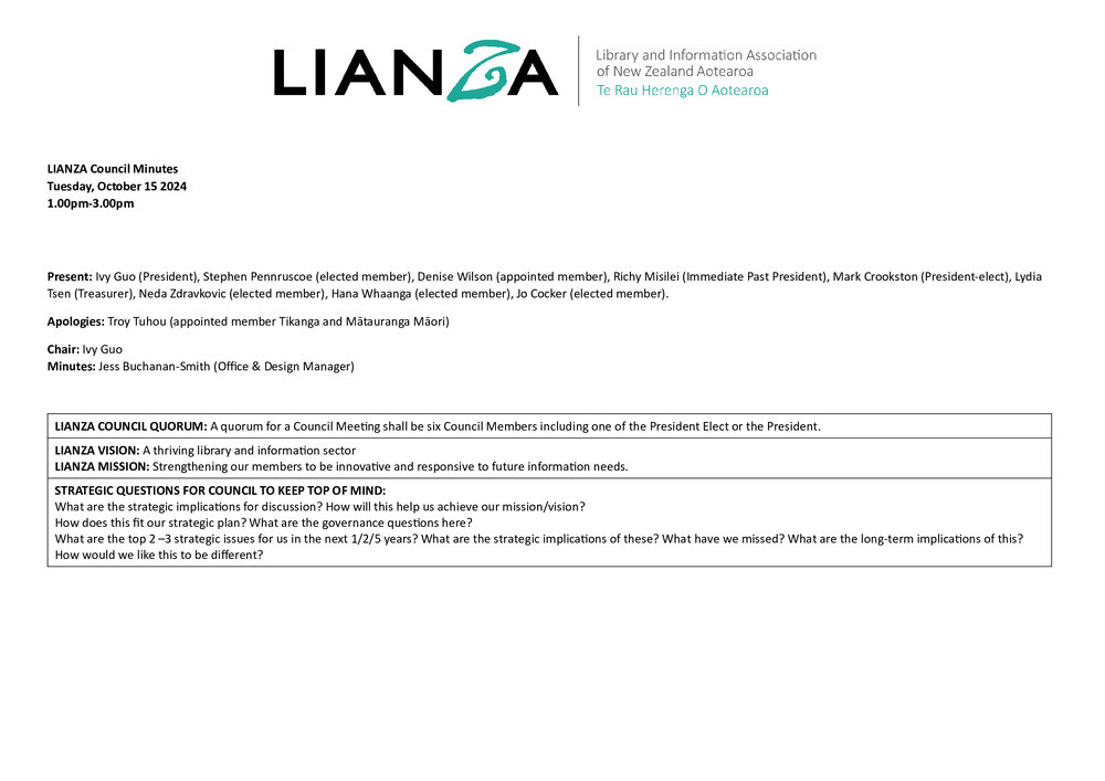 Lianza (19th Dec 2024). 151024 LIANZA Council Public Minutes. In Website Lianza. Retrieved 6th Apr 2026 06:59, from https://lianza.recollect.co.nz/nodes/view/6824