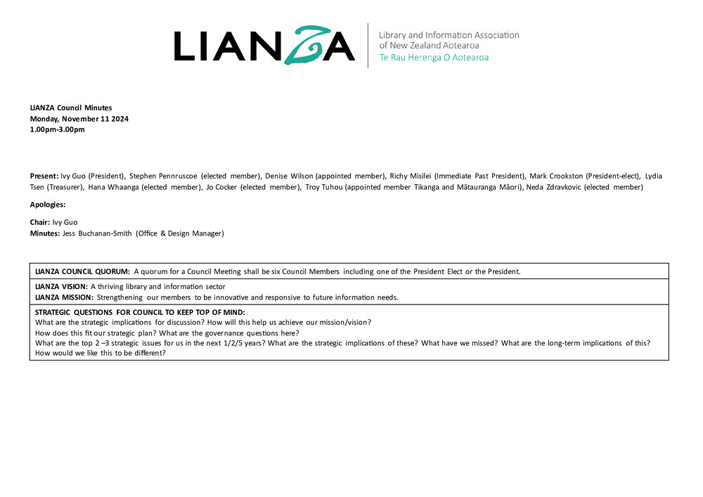 Lianza (19th Dec 2024). 111124 LIANZA Council Public Minutes. In Website Lianza. Retrieved 6th Apr 2026 06:59, from https://lianza.recollect.co.nz/nodes/view/6825