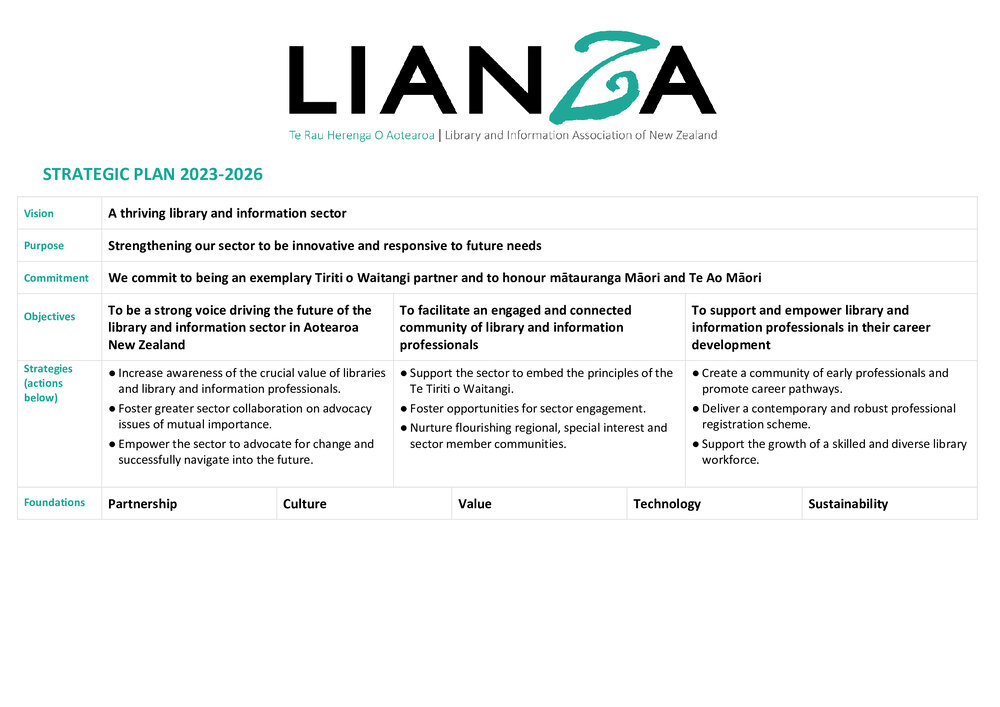 Lianza (18th Dec 2024). LIANZA Strategic Plan 2023-2026. In Website Lianza. Retrieved 29th Mar 2026 11:50, from https://lianza.recollect.co.nz/nodes/view/6829