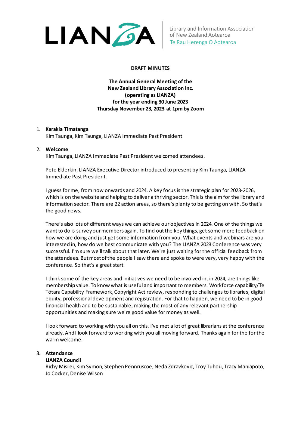 Lianza (14th Feb 2025). 2023 LIANZA AGM Minutes. In Website Lianza. Retrieved 6th Apr 2026 05:01, from https://lianza.recollect.co.nz/nodes/view/6832