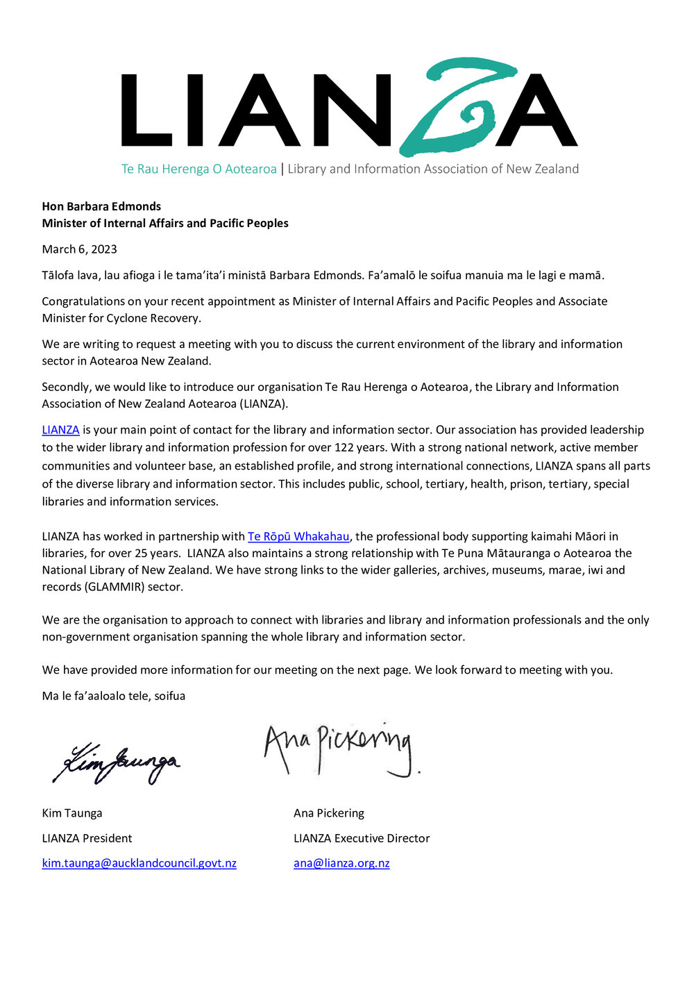 Lianza (18th Dec 2024). LIANZA Briefing for Minister of Internal Affairs 2023. In Website Lianza. Retrieved 6th Apr 2026 06:59, from https://lianza.recollect.co.nz/nodes/view/6835