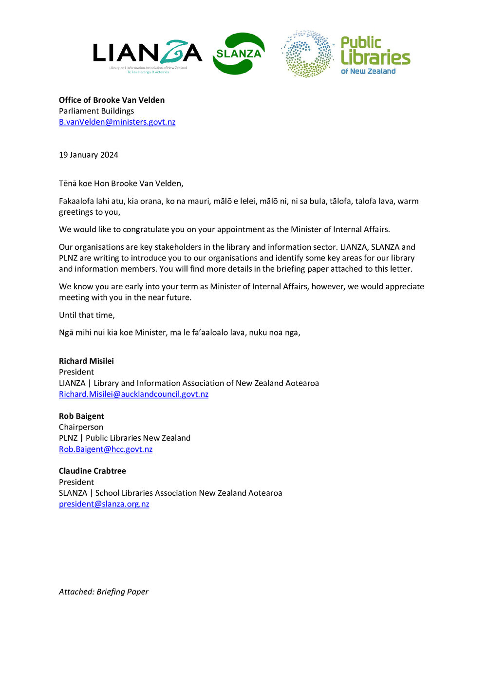 Lianza (18th Dec 2024). LIANZA Briefing the Minister 2024 Hon Brooke Van Velden. In Website Lianza. Retrieved 6th Apr 2026 06:59, from https://lianza.recollect.co.nz/nodes/view/6836