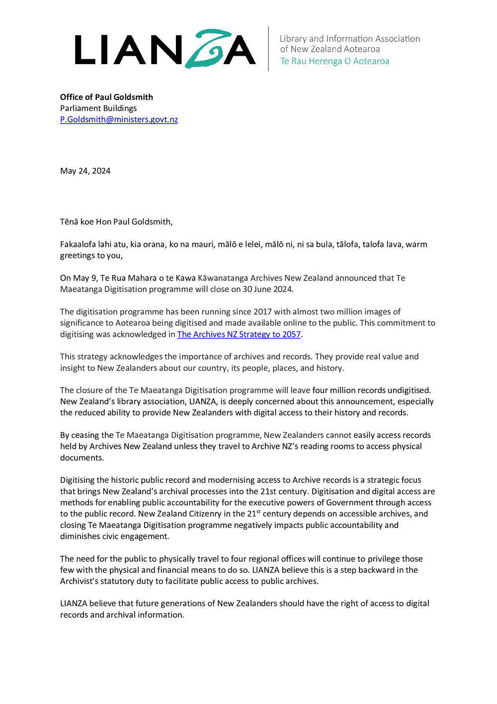 LIANZA letter to Hon Paul Goldsmith Archives NZ digitisation programme