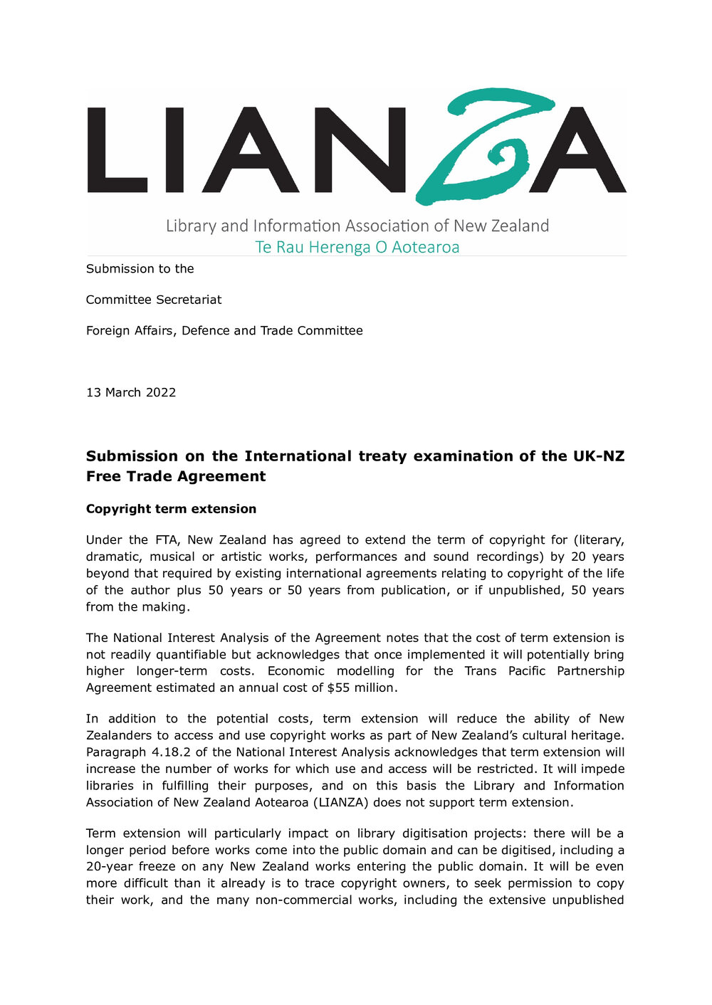 Lianza (18th Dec 2024). LIANZA NZ UK FTA submission. In Website Lianza. Retrieved 6th Apr 2026 06:59, from https://lianza.recollect.co.nz/nodes/view/6841