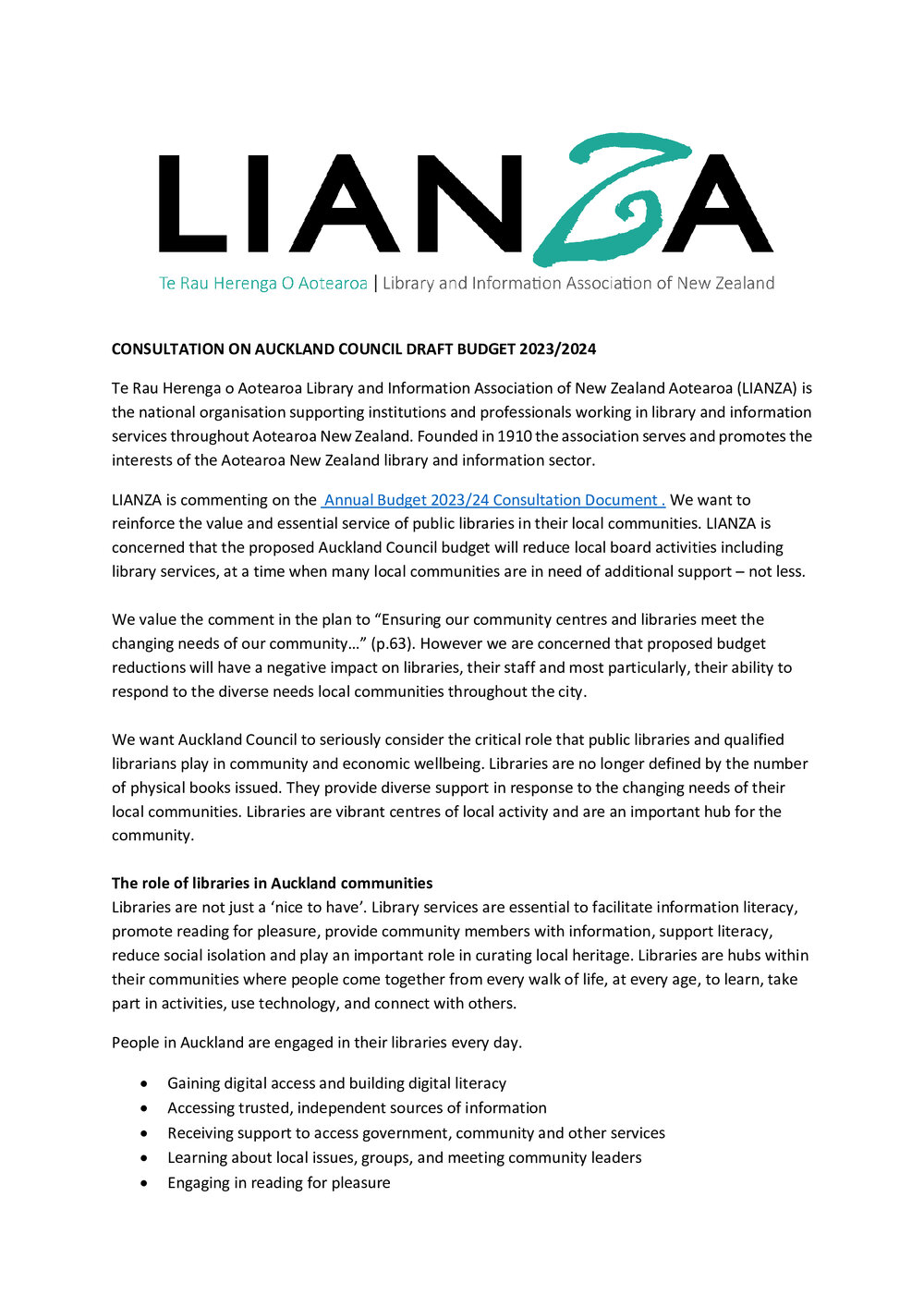 LIANZA submission Auckland Council Budget 2023/2024 consultation