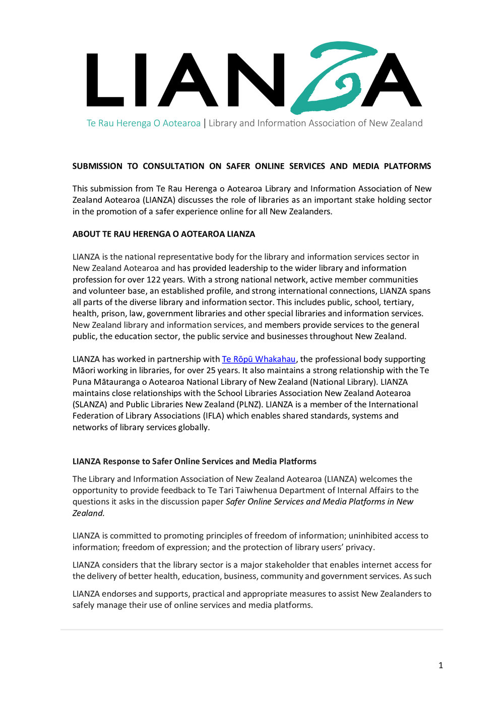 LIANZA submission Safer Online Services and Media Platforms