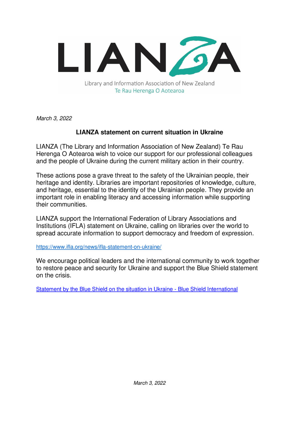 Lianza (20th Mar 2025). LIANZA Statement on current situation in Ukraine. In Website Lianza. Retrieved 6th Apr 2026 06:59, from https://lianza.recollect.co.nz/nodes/view/6849