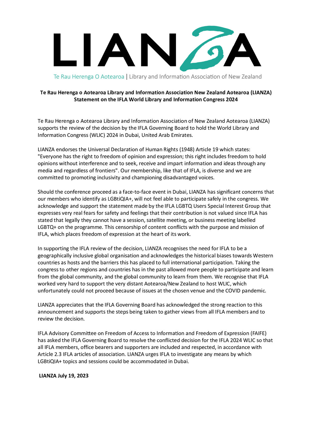 LIANZA Statement on the IFLA World Library and Information Congress 2024