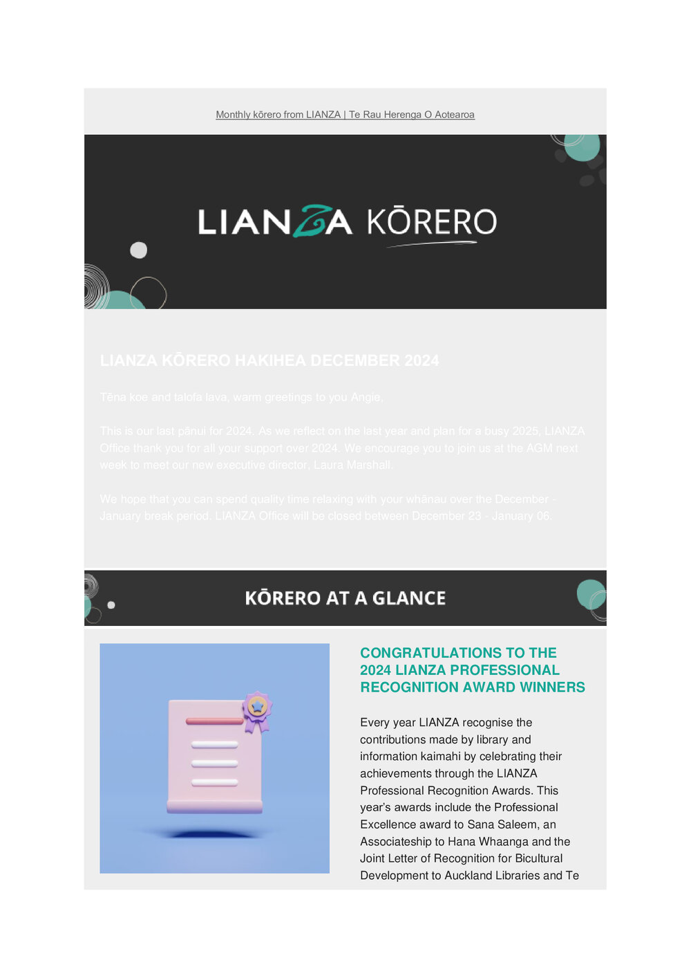 TypeLIANZA PublicationTitle of documentLIANZA Kōrero December 2024Description Kōrero newsletterType of DocumentPublic Document SeriesAuthorLIANZADate December 2024