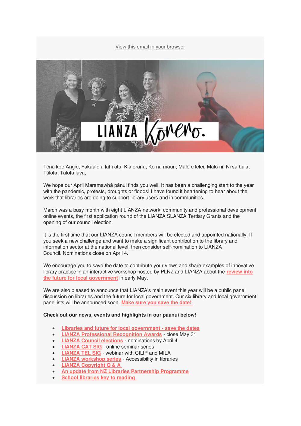 Lianza (7th Jan 2025). LIANZA Kōrero newsletter April 2022. In Website Lianza. Retrieved 6th Apr 2026 01:01, from https://lianza.recollect.co.nz/nodes/view/7072