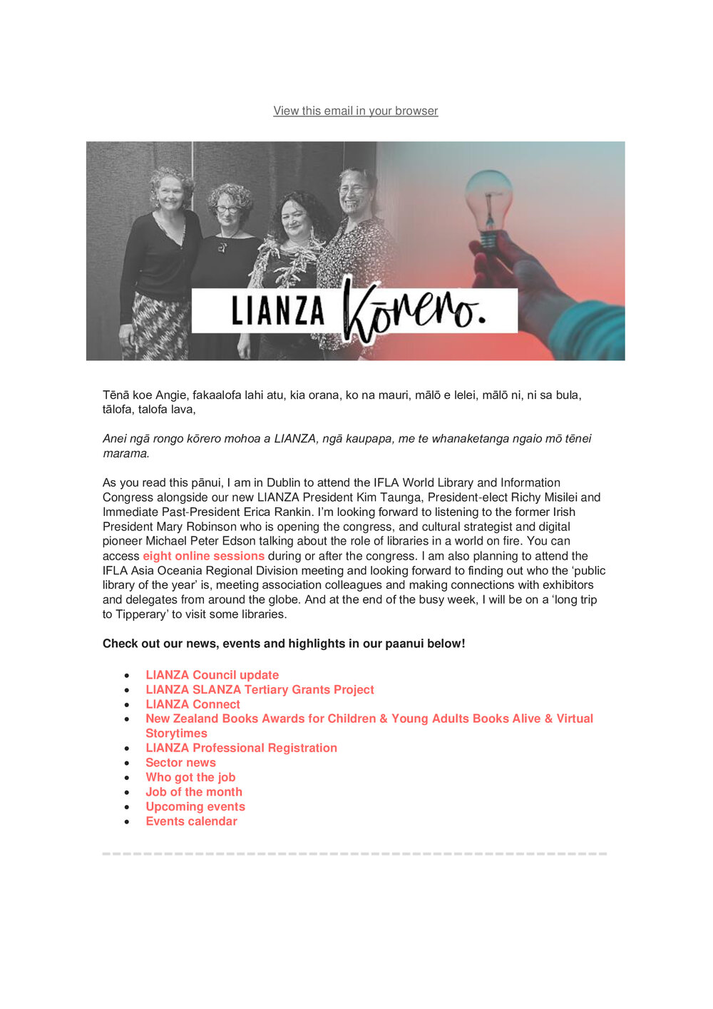 Lianza (7th Jan 2025). LIANZA Kōrero newsletter August 2022. In Website Lianza. Retrieved 6th Apr 2026 01:00, from https://lianza.recollect.co.nz/nodes/view/7076
