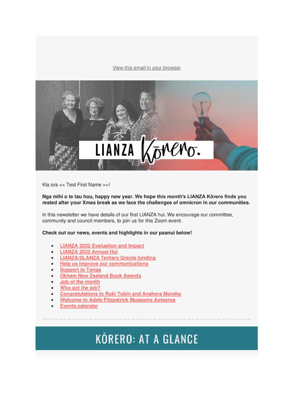 TypeLIANZA PublicationTitle of documentKorero February 2022 Newsletter Pānui Description Kōrero newsletterType of DocumentPublic Document SeriesAuthorLIANZADate February 2022