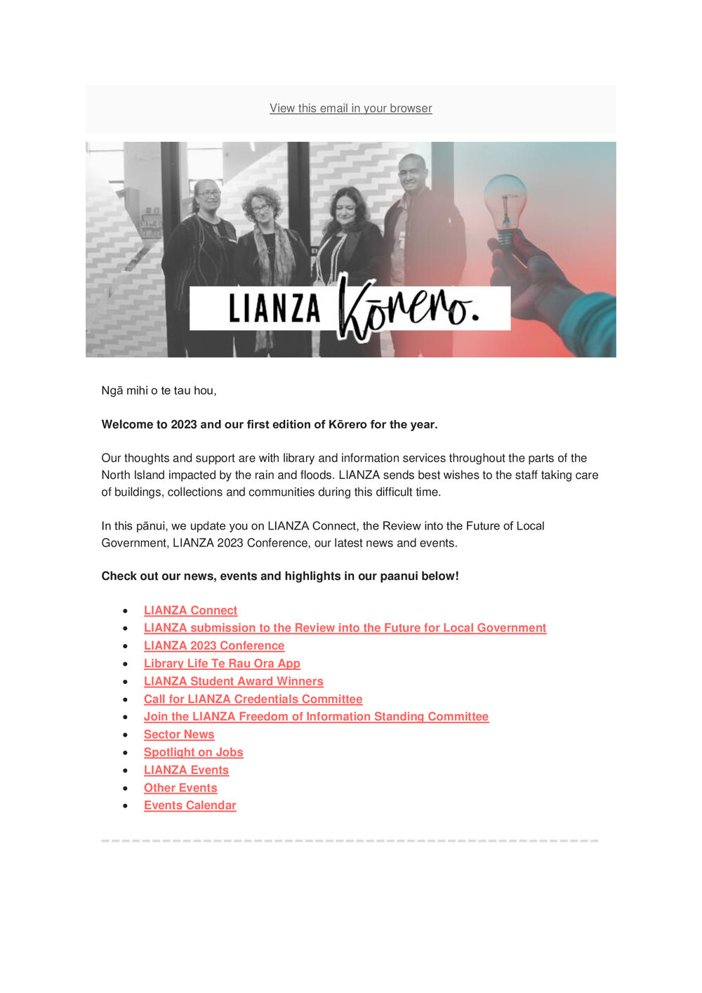 TypeLIANZA PublicationTitle of documentKorero February 2023 Newsletter Pānui Description Kōrero newsletterType of DocumentPublic Document SeriesAuthorLIANZADate February 2023