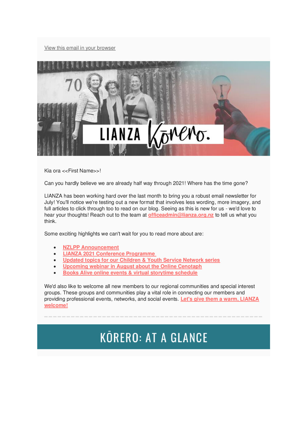 TypeLIANZA PublicationTitle of documentKorero July 2021 Newsletter Pānui Description Kōrero newsletterType of DocumentPublic Document SeriesAuthorLIANZADate July 2021