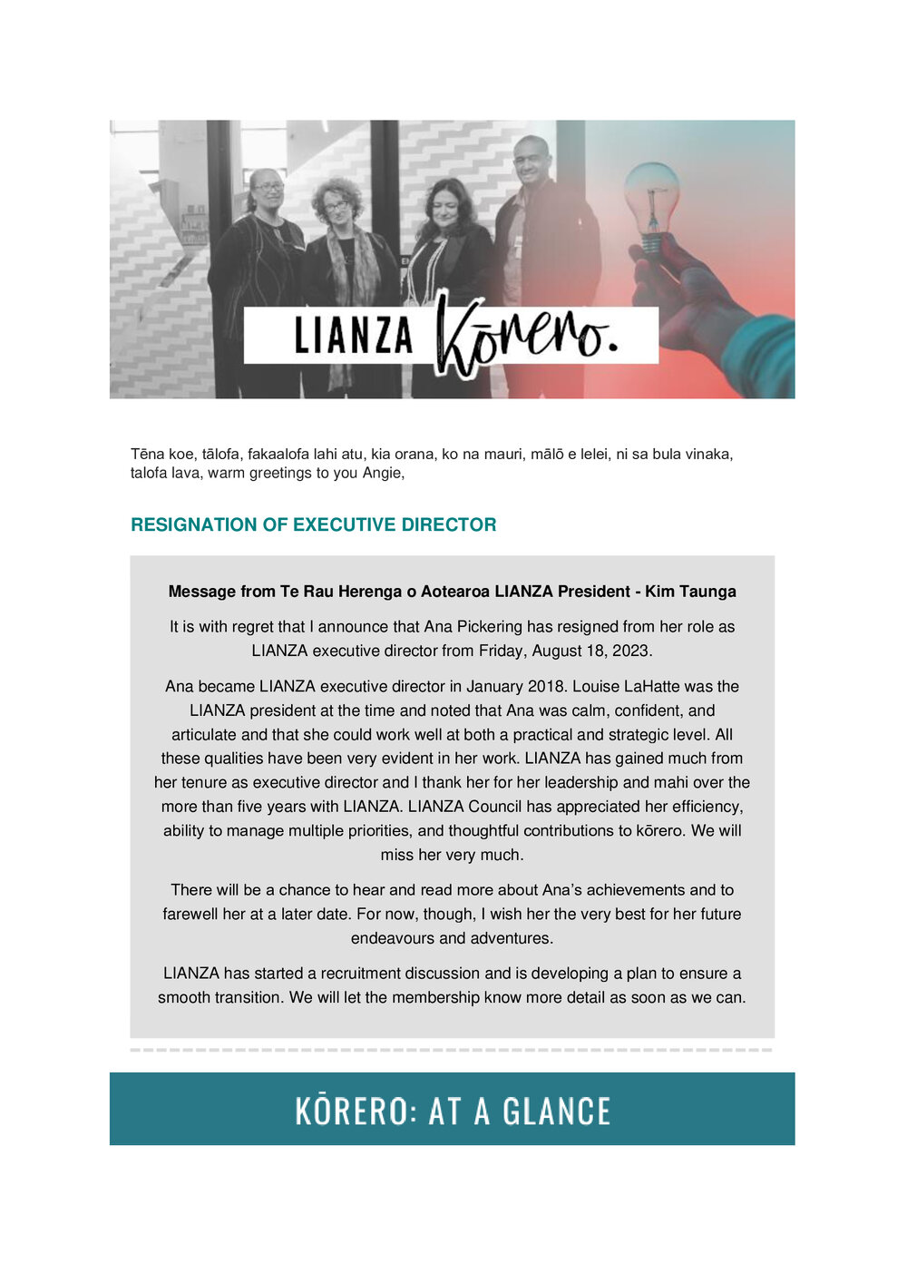 TypeLIANZA PublicationTitle of documentKorero July 2023 Newsletter Pānui Description Kōrero newsletterType of DocumentPublic Document SeriesAuthorLIANZADate July 2023