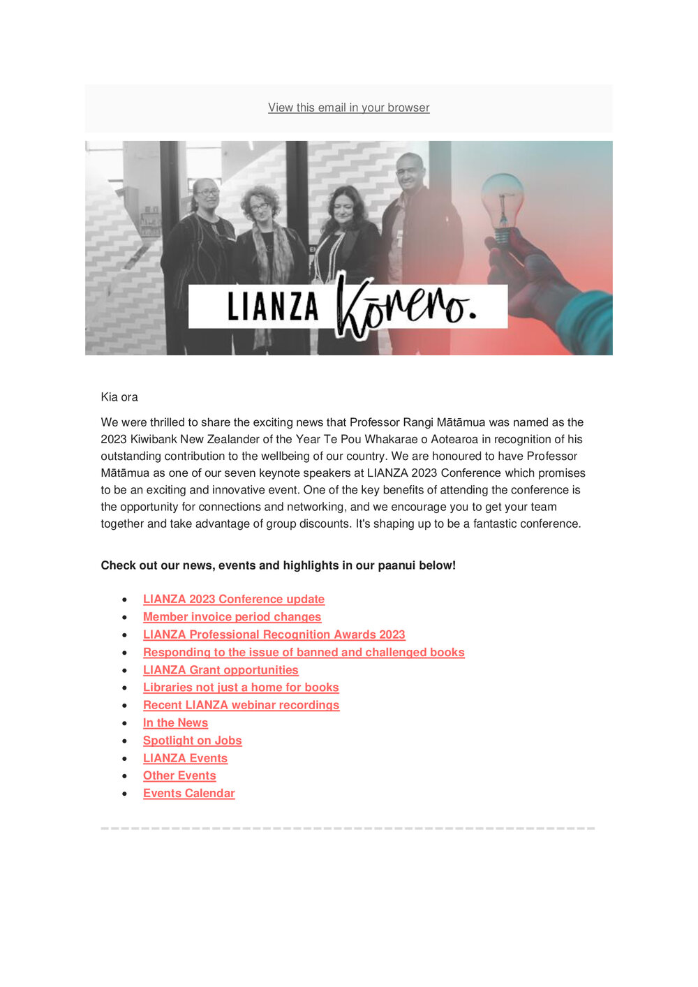 Lianza (7th Jan 2025). LIANZA Kōrero newsletter May 2023. In Website Lianza. Retrieved 6th Apr 2026 01:01, from https://lianza.recollect.co.nz/nodes/view/7095