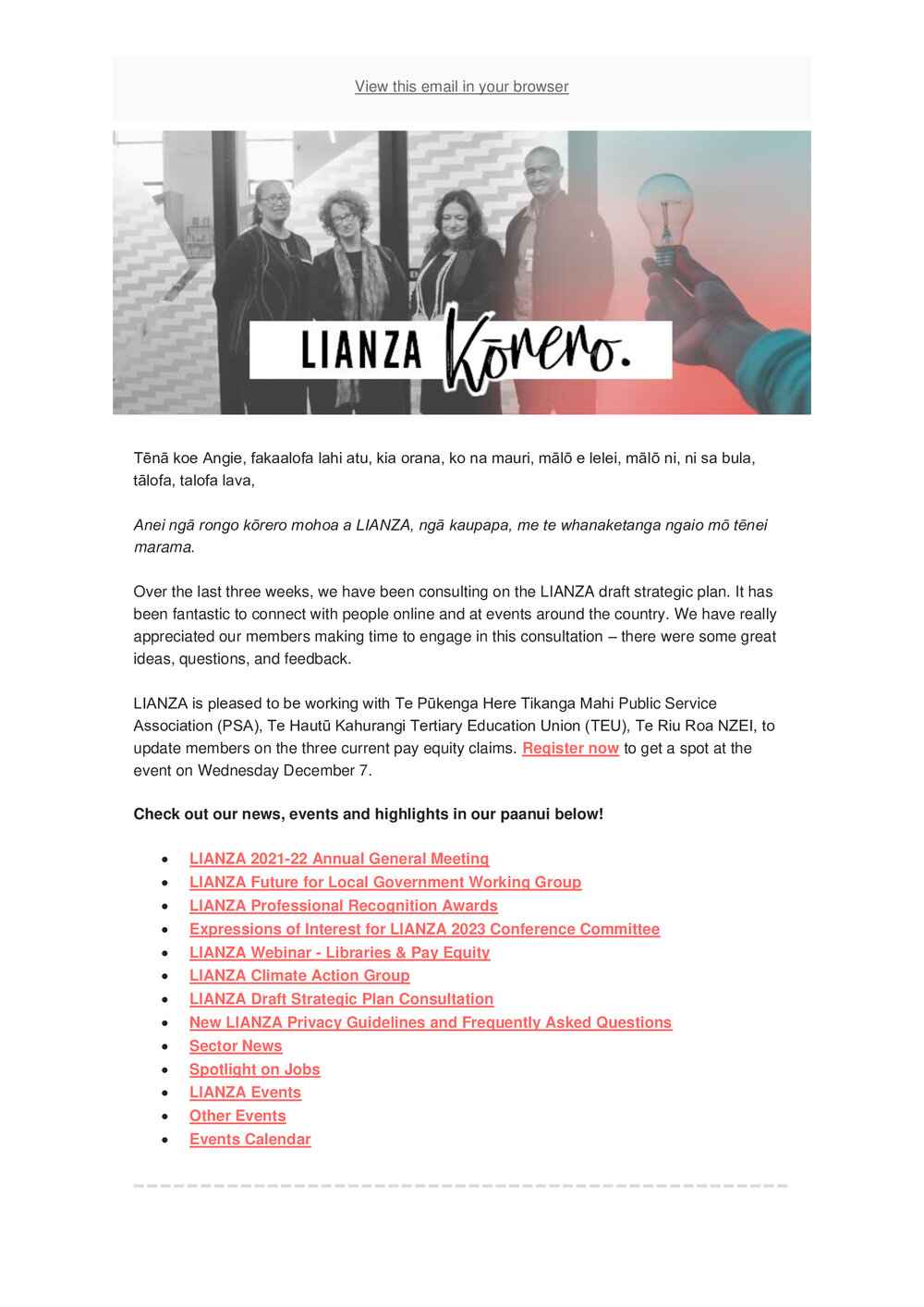 Lianza (7th Jan 2025). LIANZA Kōrero newsletter November 2022. In Website Lianza. Retrieved 6th Apr 2026 01:05, from https://lianza.recollect.co.nz/nodes/view/7098