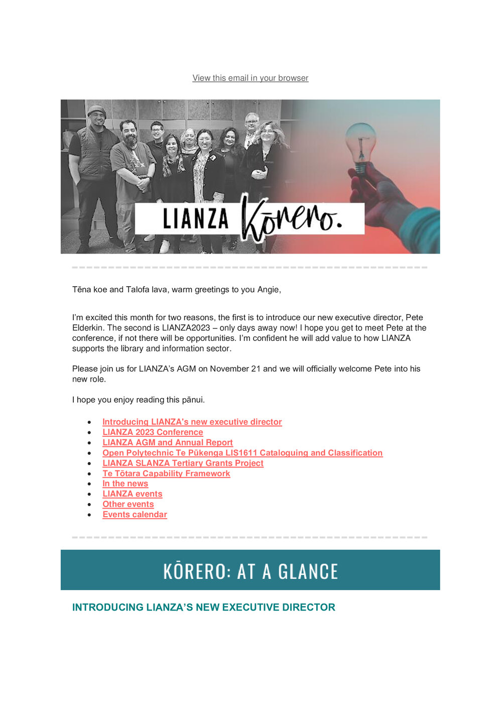 TypeLIANZA PublicationTitle of documentKorero November 2023 Newsletter Pānui Description Kōrero newsletterType of DocumentPublic Document SeriesAuthorLIANZADate November 2023