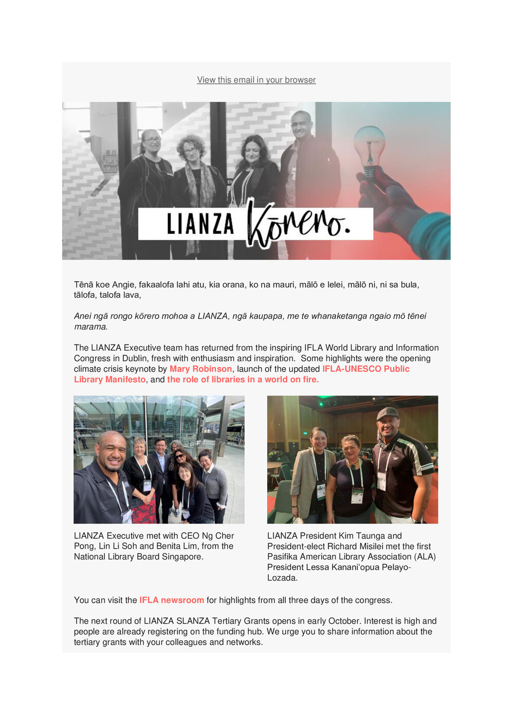 Lianza (7th Jan 2025). LIANZA Kōrero newsletter September 2022. In Website Lianza. Retrieved 6th Apr 2026 01:01, from https://lianza.recollect.co.nz/nodes/view/7103
