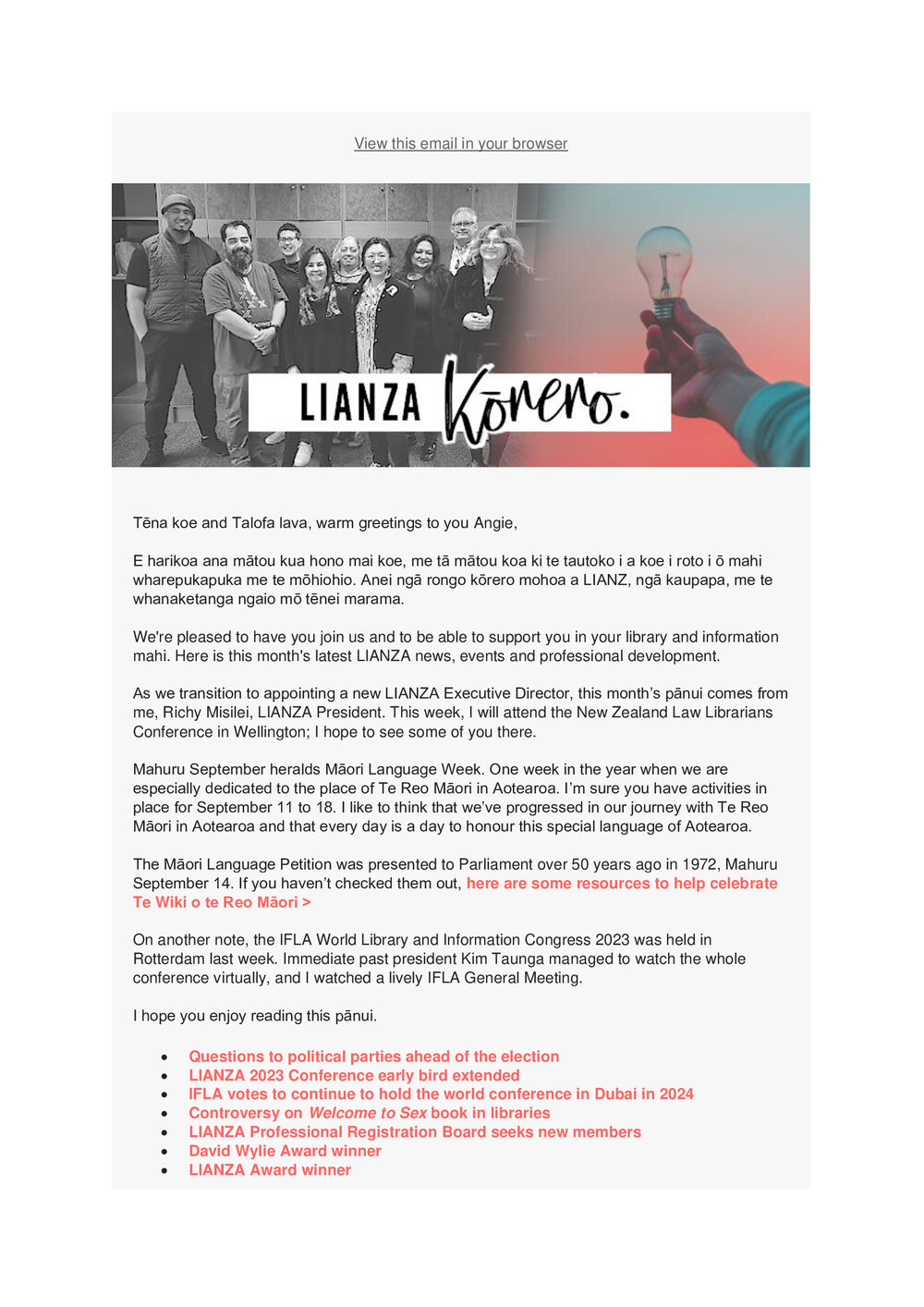 TypeLIANZA PublicationTitle of documentKorero September 2023 Newsletter Pānui Description Kōrero newsletterType of DocumentPublic Document SeriesAuthorLIANZADate September 2023