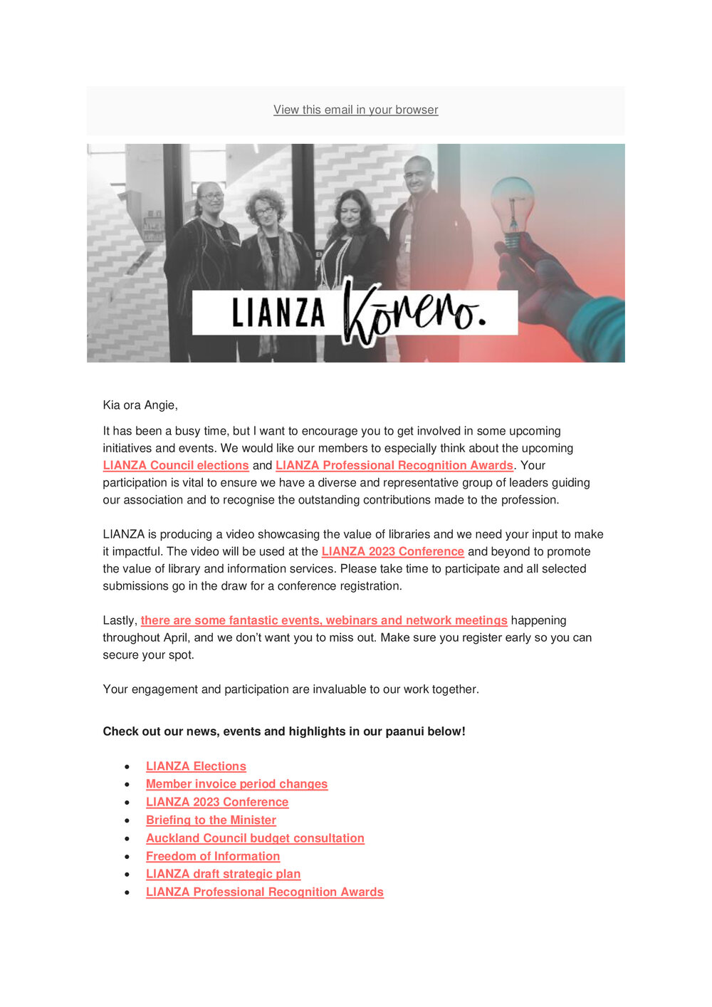 Lianza (7th Jan 2025). LIANZA Kōrero newsletter April 2023. In Website Lianza. Retrieved 6th Apr 2026 01:02, from https://lianza.recollect.co.nz/nodes/view/7105