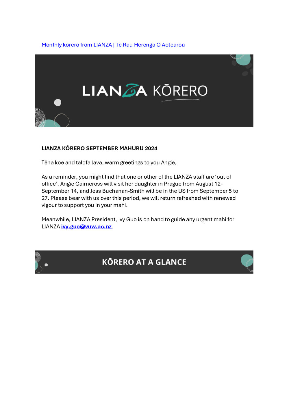 TypeLIANZA PublicationTitle of documentKorero September 2024 Newsletter Pānui Description Kōrero newsletterType of DocumentPublic Document SeriesAuthorLIANZADate September 2024