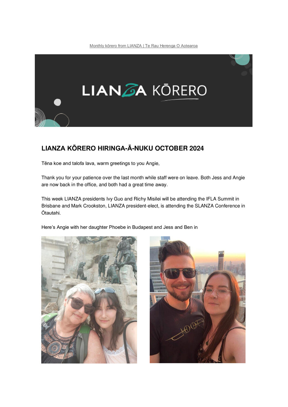 Lianza (7th Jan 2025). LIANZA Kōrero newsletter October 2024. In Website Lianza. Retrieved 6th Apr 2026 01:01, from https://lianza.recollect.co.nz/nodes/view/7109