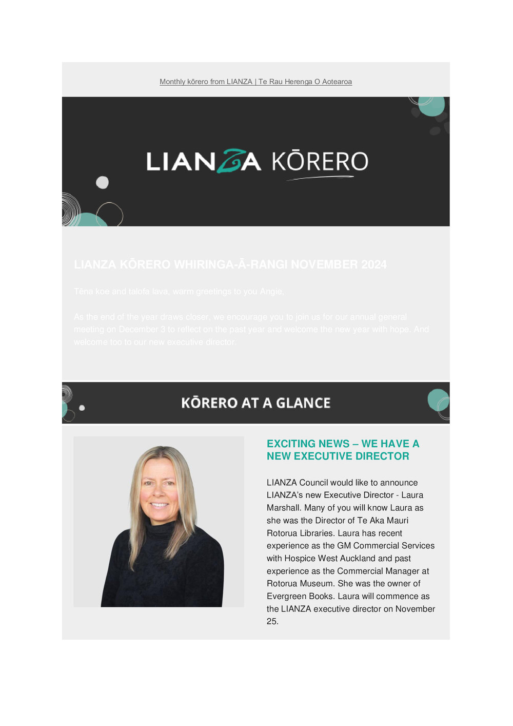 TypeLIANZA PublicationTitle of documentKorero November 2024 Newsletter Pānui Description Kōrero newsletterType of DocumentPublic Document SeriesAuthorLIANZADate November 2024