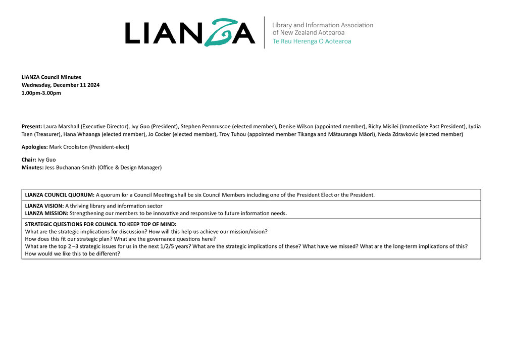 Lianza (24th Jan 2025). 111224 LIANZA Council Public Minutes. In Website Lianza. Retrieved 6th Apr 2026 00:59, from https://lianza.recollect.co.nz/nodes/view/7129