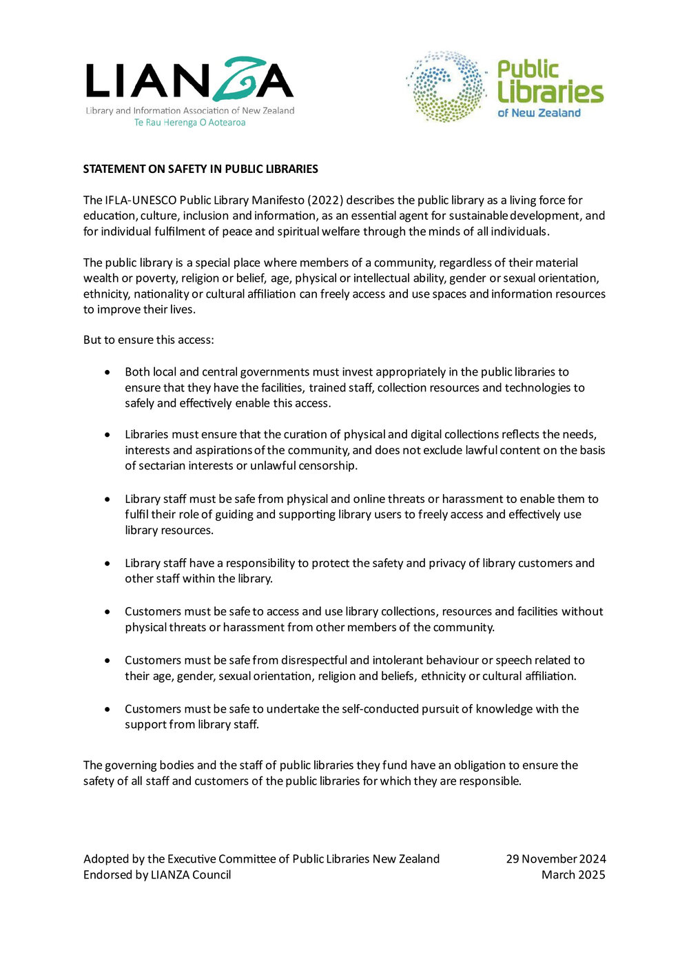 PLNZ and LIANZA Joint Statement on Safety in Public Libraries 2025