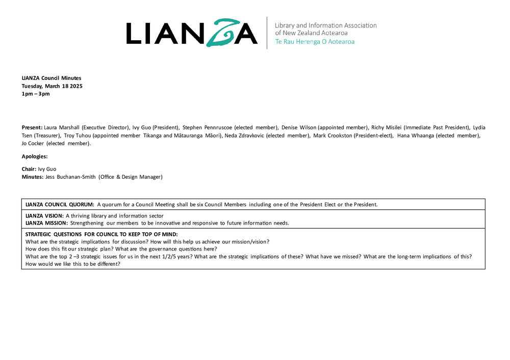 Lianza (31st Mar 2025). 180325 LIANZA Council Public Minutes. In Website Lianza. Retrieved 6th Apr 2026 00:59, from https://lianza.recollect.co.nz/nodes/view/7142